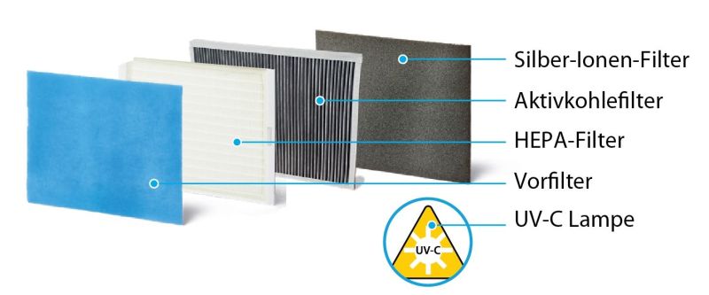 Der VisionAir Blue Line MicrobeFree kombiniert mehrere bewährte Technologien und das auf so kleinem Raum, dass man ihm dieses Potential gar nicht ansieht: Vorfilter, Hepa-Filter, Pleated Filter, Silberionen-Filter, UV-C-Licht und schneller Luftdurchsatz. Die Reinigung der Luft erfolgt in fünf Phasen.